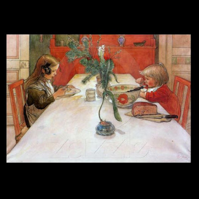 Description:Sister and brother share a simple winter's evening meal of bread and soup. The sense of intimacy is heightened by the long dining table obviously meant to accommodate a large family (and the Larsson family was indeed quite large!).